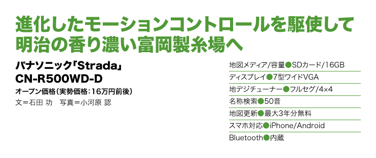 富岡製糸場への旅のお供はパナソニック「ストラーダ」の2013年モデル、CN-R500 WD-D。地図用に16GBのSDカードを搭載したメモリーAVナビの最新モデルである。モニターは7型ワイドVGAで、ボディーサイズは一般的な2DINサイズよりも幅広い横幅200 mmのワイドボディーで、トヨタ、ダイハツ、日産などのワイドコンソール採用車にフィットする。