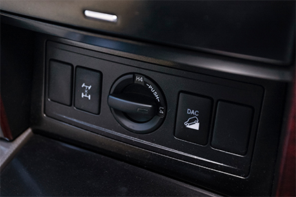 ダイヤル式トランスファー切り替えスイッチと、センターデフロックスイッチ、ダウンヒルアシストコントロールスイッチ。悪路走破性能に妥協しない、本格SUVの証しである。