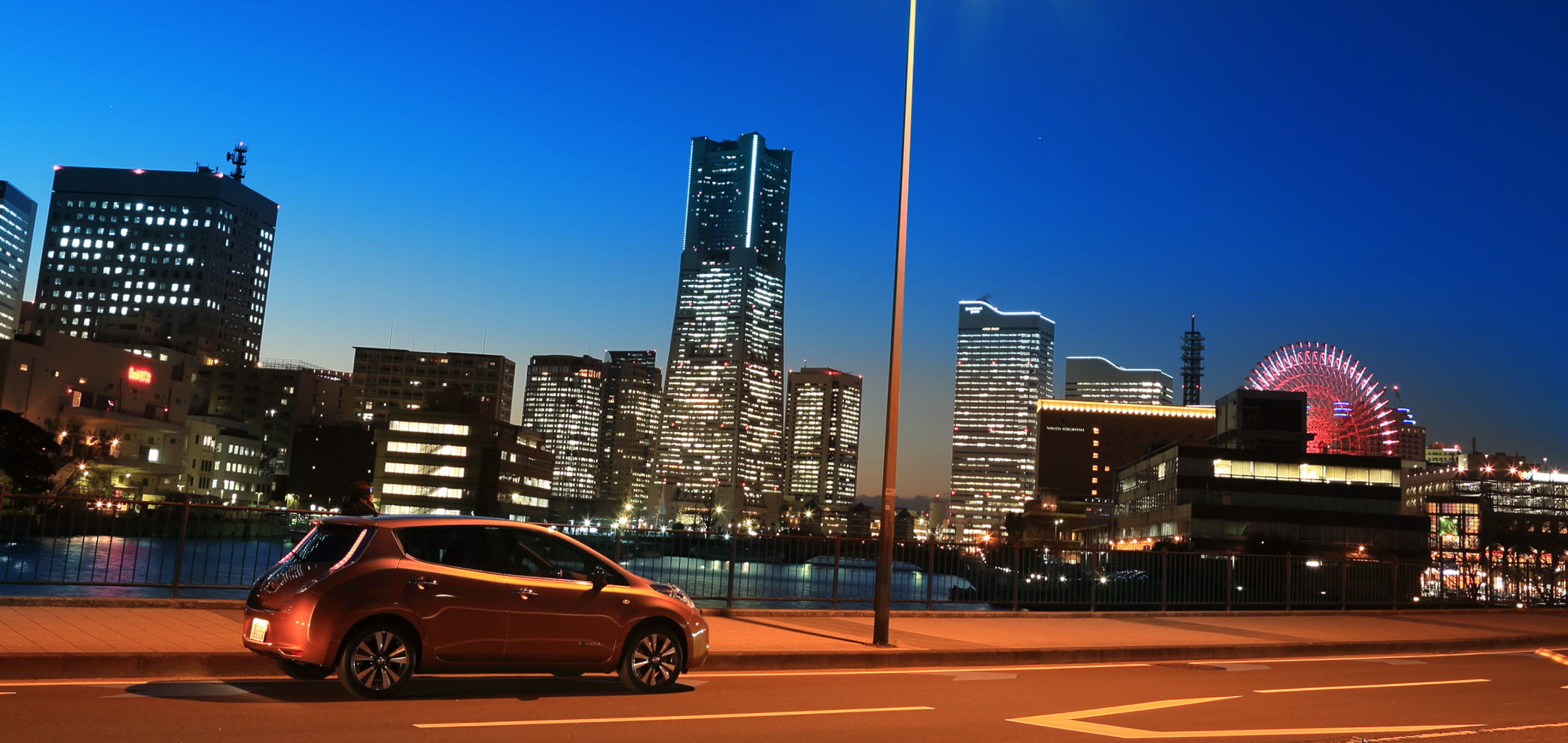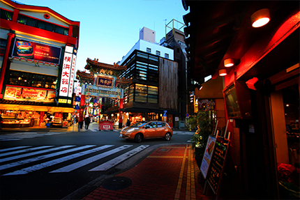 夕暮れの横浜・中華街を行く「日産リーフ」。EV専用の「NissanConnectナビゲーションシステム」を利用して検索すると、この付近にも多くの急速充電器が設置されていた。
