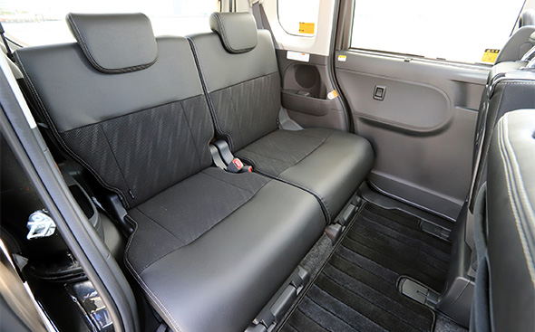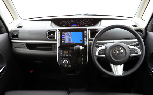 内装もエクステリアと同様に上質な仕立てだ。全体が黒基調で統一されていて、大人の落ち着きが感じられる。同時に走りを予感させる雰囲気も醸し出しており、シルバー加飾の施された革巻きステアリングホイールが実に手になじむ。ダッシュボードとドアのコンソールは大理石調のパネルで仕立てられていて、柔らかな素材のファブリックとの組み合わせがまた上質感を高めている。ここのところ、軽自動車の質感の向上には目を見張るものがあるが、なかでもタントカスタムのこの内装は随一と言っていい。格上の普通車にも勝るとも劣らない仕上がりである。