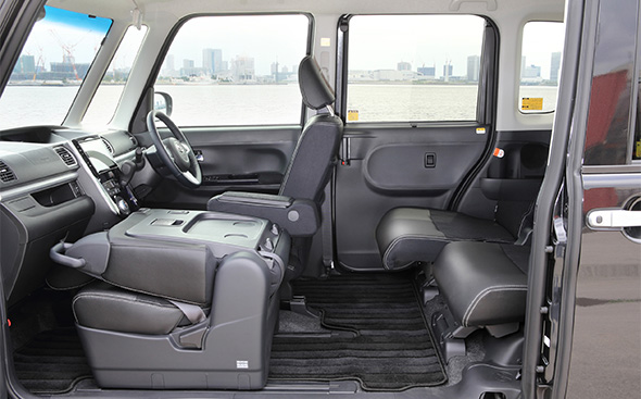 シートのバリエーションは多彩で、乗員の数や荷物の大きさなどに合わせてアレンジが可能。助手席は前方へ最大380mm、リアシートも前後に240mmスライドさせることができる。後席にはリクライニング機構も装備されているので、助手席を倒すと現れる簡易テーブルにドリンクを置いてくつろぐのもいい。さまざまなシーンで使いこなせる懐の広さが、アクティブな生活を支えてくれる。