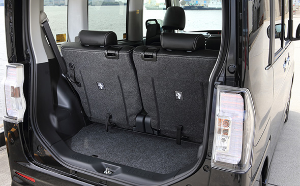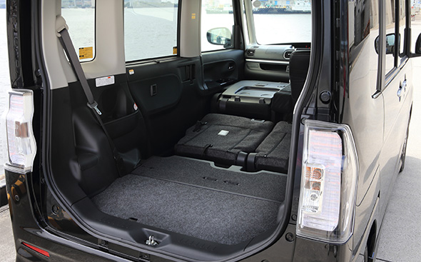 室内高は1365mmもあるから、たいていのものは載せられる。衝動的に観葉植物を買ってしまっても心配はいらない。横に長いものだって大丈夫だ。リアシートはダイブダウンさせることができるので、たためば広大かつ完全にフラットな荷室空間が出現する。助手席も倒してしまえば、長さのある釣り竿(ざお)だろうとスキー板だろうと積める。荷物の出し入れが面倒に思えるかもしれないが、タントカスタムには「ミラクルオープンドア」がある。ボディーの左側はセンターピラーがドアに内蔵されており、スライドドアを開ければ開口幅は1490mmに達する。
