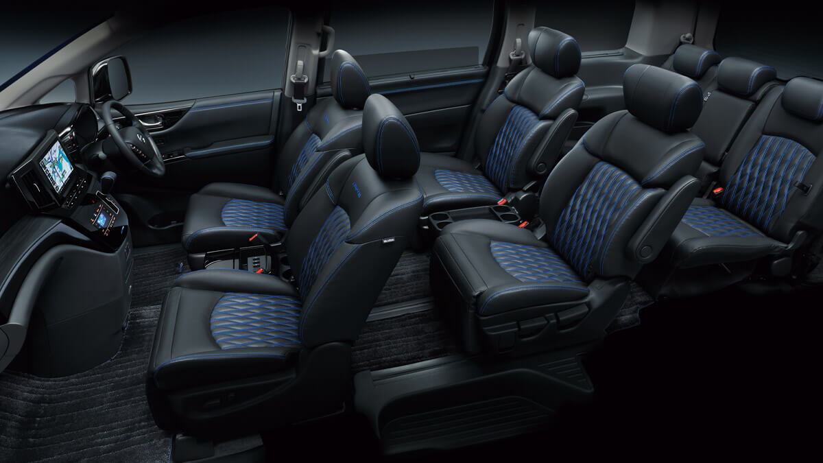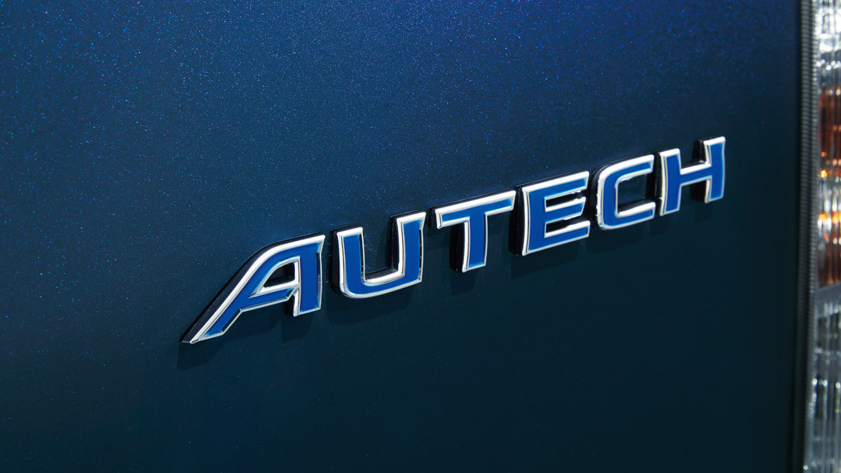 パッと見た瞬間、昼夜を問わずAUTECHだとわかるのは、フロントバンパーでブルーに輝くシグネチャーLEDがその出自を主張するから。ブルーは、オーテックジャパン創業の地である湘南・茅ヶ崎の海と空をイメージしたものだという。シグネチャーLEDに加えて、ダーククロームのフロントグリルや光沢のある専用パーツが、風格のあるエルグランドのたたずまいをさらに堂々としたものにしている。