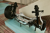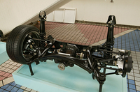 新型のフロントサスペンションは、ダブルウィッシュボーン、リアはマルチリンク式。前脚はアームの取り付け位置から、後脚はリンクの取りまわしから見直された。ダンパーに、オイルと高圧ガスを分離させた「モノチューブショックアブソーバー」を採用したこともジマンだ。