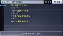 例えばこんな感じ。スマートコマンダーの2番のボタンを押し、しばし待つと待ち受け状態が整ったことを知らせる合成音が鳴るので「軽井沢の観光スポット」などと言ってみる。すると認識したワードが画面にリストアップされるので、そこから探したいジャンル等にタッチ。すると自車位置から近い順に、軽井沢の観光スポットがリストアップされるという具合だ。ヒット率はともかく、認識率は非常に高く、何度試してもほぼ間違いなく発話した言葉を正確に認識してくれた。これはたいしたものだ。
