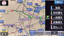 ナビにまかせた推奨ルート、目的地に急ぐときの有料優先ルート、のんびり走るときの一般優先ルート、最短距離で目的地に着く距離優先ルート、別ルートの5つを探索可能。渋滞予測データやオンデマンドVICSによる渋滞情報も考慮しながら、状況に応じたルート探索を行う。それぞれの検索結果は、リスト表示して料金や距離、所要時間等を見比べながら、好みのルートを選択可能。地図上でも、色分けしたルートでそれぞれのルートの確認が可能だ。また、エコ度のチェックもできる。推奨ルートは、できるだけ広い主要道を選ぶイメージだが、今回一度だけ主要道から外れ、抜け道っぽいルートを選んだことがあった。未確認だが主要道が渋滞していたのだろう。