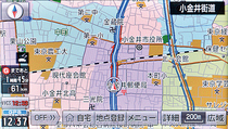センターを通じて、通信によりリアルタイムの渋滞情報を取得するオンデマンドVICSに対応。ビーコンなどのユニットを設置しなくても渋滞情報をキャッチできる。受け取った渋滞情報は、地図に表示できるほか、渋滞を考慮したルート探索にも反映。刻々と変わる渋滞状況に対応して、5分ごとにセンターから最新の渋滞情報を受け取る。写真では赤い矢印の渋滞箇所のほか、青の矢印で順調に走れる箇所も表示されているが、その表示をする/しないは設定で変更できる。なお、このオンデマンドVICSは有料のサービス。購入する際はイクリプスのホームページのマイプロフィール・ユーザー登録サイトにアクセスして手続きする。