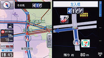一般道の交差点案内はオーソドックスな俯瞰(ふかん)図。交差点拡大図には、交差点付近にある施設のアイコンや交差点名、レーン情報、交差点までの距離が表示され、画面サイズが9型ワイドと大きいことも味方して、とてもわかりやすい。ちなみに、写真の交差点拡大図内の交差点左上にあるのは焼き肉店のアイコン。これだけは一瞬「なに?」と思って、実際に建っている施設を確認してしまった。左の地図側を見れば、上のほうに次の交差点のレーン案内も表示。ルートを先取りできるのはうれしい。地図表示をレーンリストに切り替えれば、画面の半分を使って推奨走行レーンを細かく案内することも可能。運転に不慣れな人が複数車線の広い道を走るには便利かも。