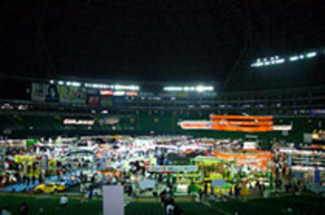 【写真上】いつもはプロ野球の熱戦が繰り広げられる福岡ドームが、この日はクルマ好きの祭典に。ふだんは広く感じるグラウンドもこの日はいくつものブースが所狭しと並んでいた。