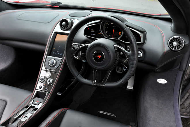 4/15マクラーレンMP4-12Cスパイダー ボディーサイズ:全長×全幅×全高=4509×2093×1203mm/ホイールベース:2670mm/車重:1376kg(乾燥重量)/駆動方式:MR/エンジン:3.8リッターV8 DOHC 32バルブターボ/トランスミッション:7段AT/最高出力:625ps/7500rpm/最大トルク:61.2kgm/3000-7000rpm/タイヤ:(前)235/35ZR19 (後)305/30ZR20/価格:3000万円