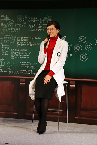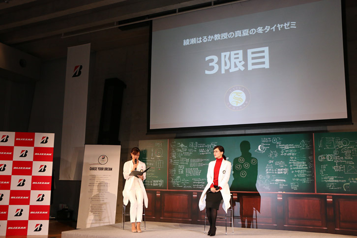 3/12「ブリザック」のCMキャラクターを務める綾瀬はるかさんは、白衣とメガネ姿の“教授スタイル”で登場。CM撮影時の裏話などを披露した。