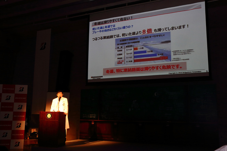 2/12「ブリザック」の特長について説明する、ブリヂストンタイヤジャパン 消費財マーケティング本部の渡部亮一氏。