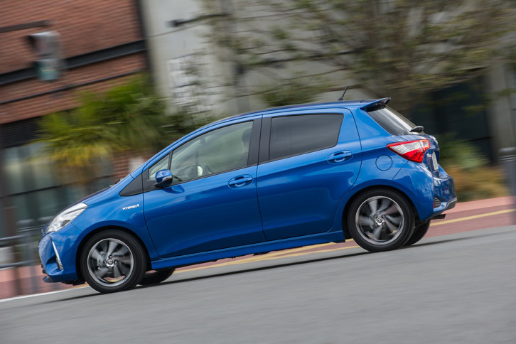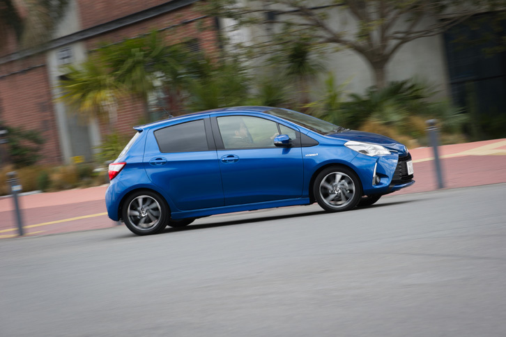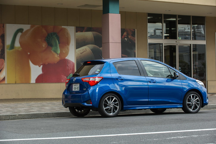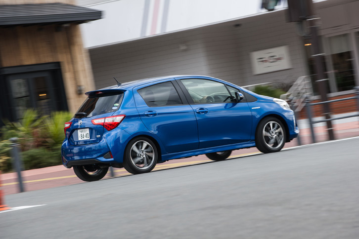 14/35神奈川・横浜の市街地を走る「ヴィッツ ハイブリッド」。空力パーツのサイドスカートとリアルーフスポイラーも「Sportyパッケージ」の特徴となっている。