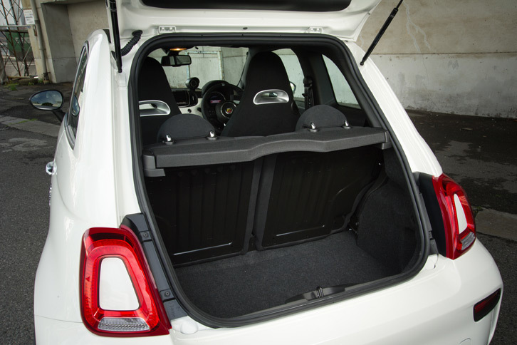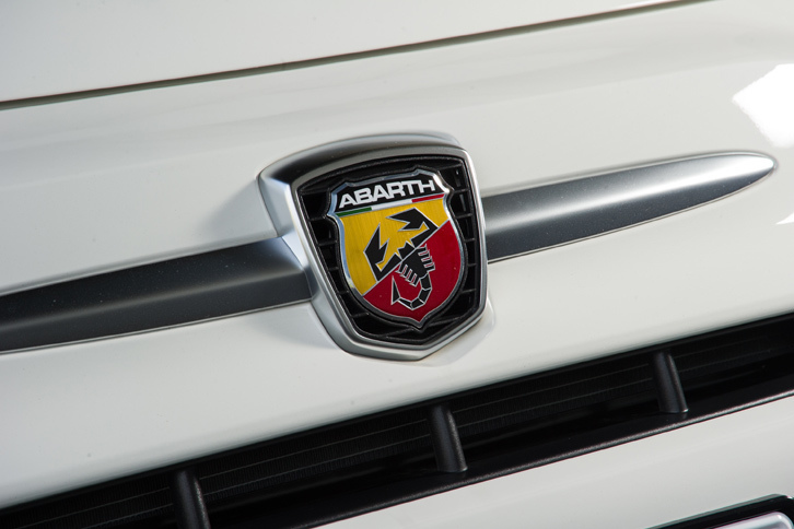 7/35テールゲートを飾る、アバルトのエンブレムと「500」のロゴ。ダッシュボードの助手席側にも、500のロゴが残されている。