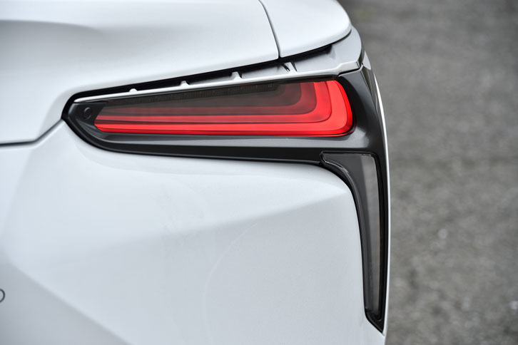 10/34テールエンドに貼られた「LC500h」のバッジ。