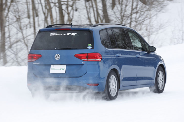 8/13「ウィンタートランパスTX」を装着した「フォルクスワーゲン・ゴルフトゥーラン」。前輪駆動ながら、外周路で軽快な走りをみせた。