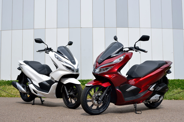 12/14「PCX」シリーズには、電動仕様(写真左)とハイブリッド仕様(同右)もラインナップされる。電動仕様は2018年内に、ハイブリッド仕様は2018年夏に発売される予定。