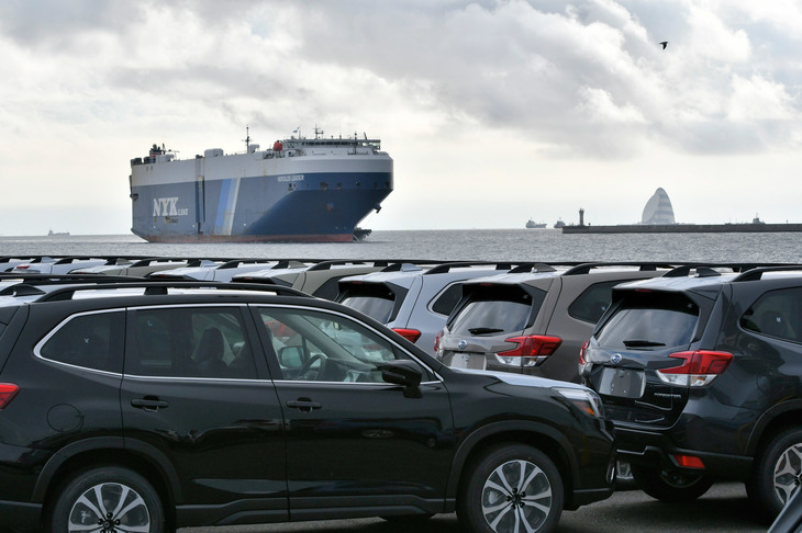1/17ふ頭に接岸する自動車運搬船と、船積みを待つスバルの輸出車両。