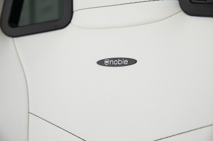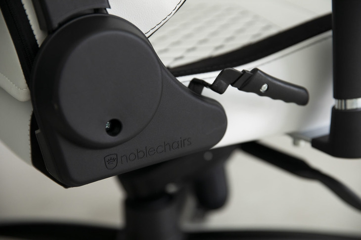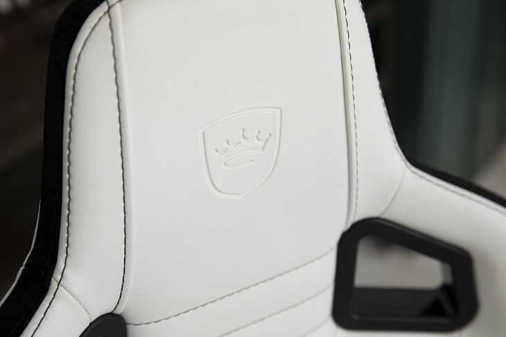 11/36「EPIC Premium White(エピック プレミアムホワイト)」の右側サイドサポート部分に「noblechairs」のロゴが入る。