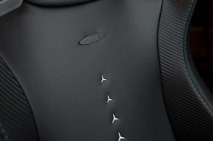 5/36「EPIC Mercedes-AMG Petronas Motorsport Edition(エピック メルセデスAMGペトロナス モータースポーツ エディション)」のヘッドレスト部分。メルセデスAMGペトロナスF1チームのロゴが刺しゅうされている。