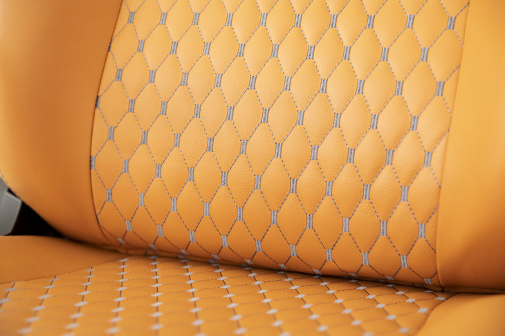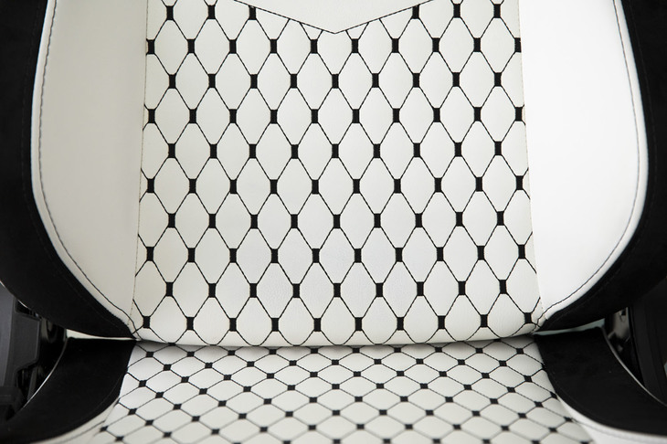 6/36ヘッドレスト背後にも、前面と同じ刺しゅうが入る。シート表皮はハイグレードなPUレザー、座面や背もたれのクッションには弾力のある高密度モールドウレタンが使用されている。一般的なソファやオフィスチェアの表皮が0.8mmから1.2mmの厚さであるの対して、「EPIC(エピック)」シリーズでは1.5mmの厚みのものを採用。しわが寄りにくく耐久性に優れるという。
