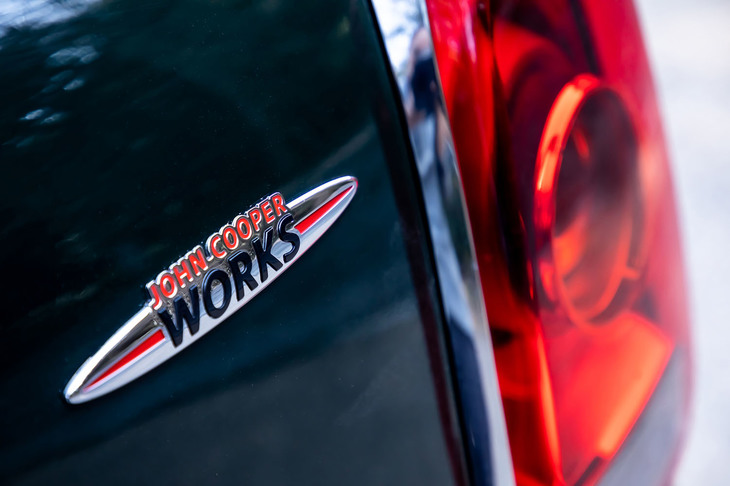 8/19試乗車では19インチサイズの「John Cooper Worksサーキットスポーク2トーン」ホイールに225/50R19サイズの「ピレリPゼロ」タイヤが組み込まれていた。