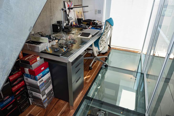 10/12オーナーの趣味のひとつがミニカーの製作とコレクション。キットを組み上げて仕上げるのが楽しみだとか。金属フレームテーブルのガラス製天板には、趣味人にふさわしいこだわりの逸品が並ぶ。ロフトへ続く階段とガラス製の床との間にミニカーを愛でるスペースがある。