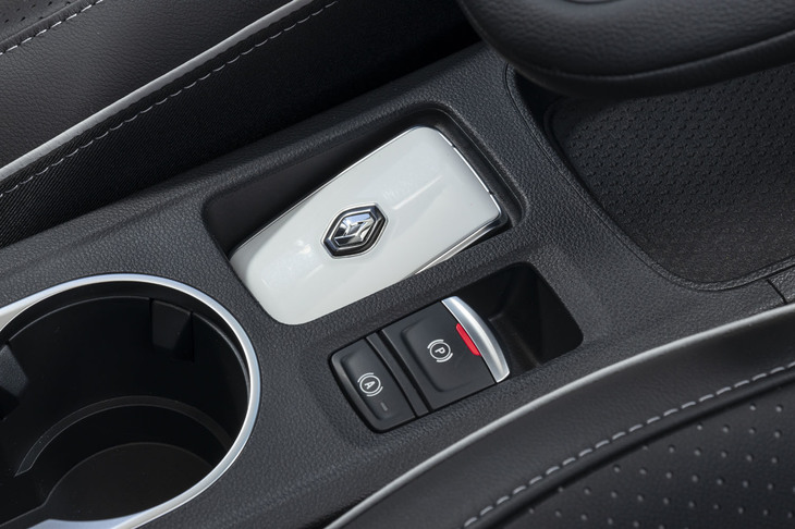 26/42「キャプチャー」のシフトパネルまわり。フライングセンターコンソールと呼ばれる宙に浮いたようなデザインが特徴。下段にはスマートフォンの非接触充電トレーが備わっている。
