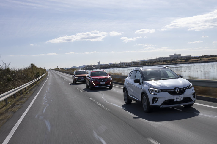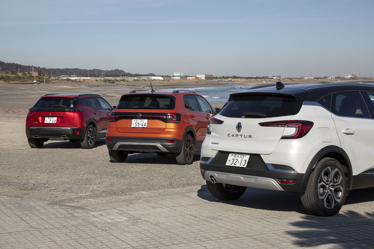 2/42今回試乗したのは「ルノー・キャプチャー」(中央)と「フォルクスワーゲンTクロス」(右)、そして「プジョー2008」(左)の3台。各車、300万円前後の価格設定となるガチのライバルである。