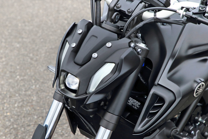 2/16マイナーチェンジによって大幅に意匠が変更された「MT-07」。ロー/ハイビーム一体型の「バイファンクションLEDヘッドランプ」を用いた、“ひとつ目”のフロントマスクが目を引く。