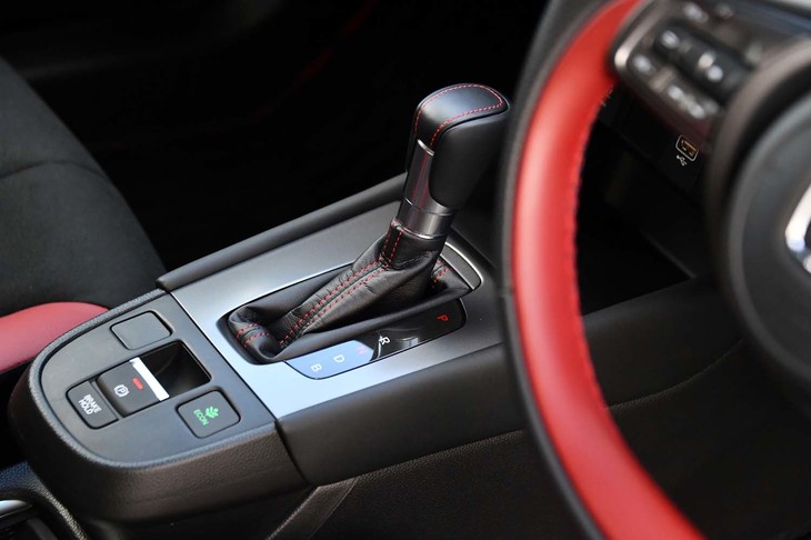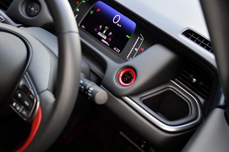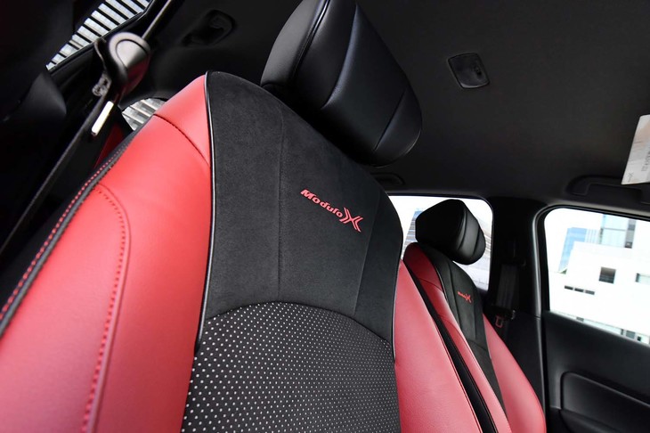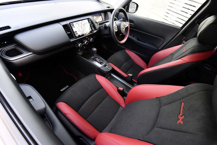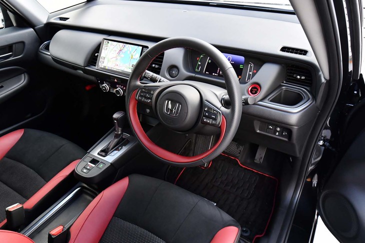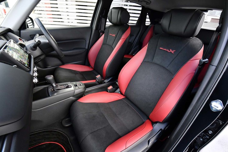 22/70ブラック×ボルドーレッドのコントラストが鮮やかな「フィットe:HEV Modulo X」のインテリア。ほかに、ブラック単色のインテリアカラーも選べる。