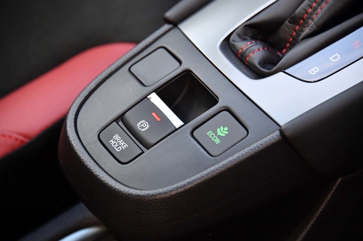 4/70「フィットe:HEV Modulo X」は、インテリアにも独自のドレスアップが施される。写真はそのひとつ、ボルドーレッドのレザーがあしらわれた本革巻きステアリングホイール。