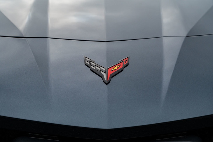 22/29リアカウルに装着されたスティングレイ(Stingray:アカエイ)のエンブレム。先代の「C7」以降、米国での「コルベット」の正式名称は、往年のサブネームが復活して「コルベット スティングレイ」となっているが、日本では従来通り「コルベット」のままだ。