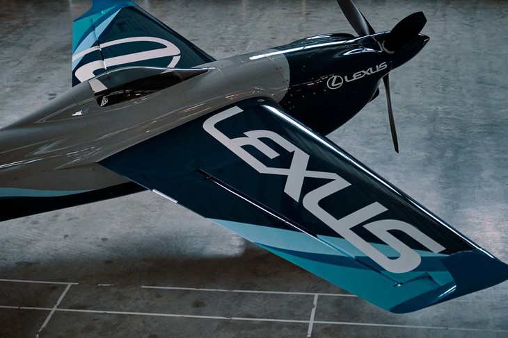 1/4室屋義秀選手と、LEXUSロゴの入ったエアロバティック用の航空機。写真右上は「レクサスLC」の限定車である“アビエーション”。