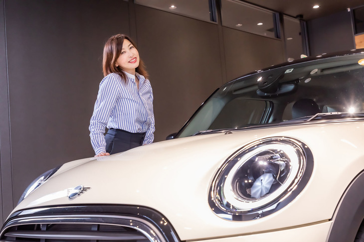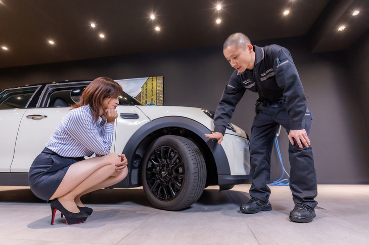 2/28「MINIクーパー 5ドア」を購入したばかりというカーライフ・エッセイスト吉田由美さん。MINIつくばで“スターマークタイヤ”と呼ばれるMINI承認タイヤに関する話を聞いた。