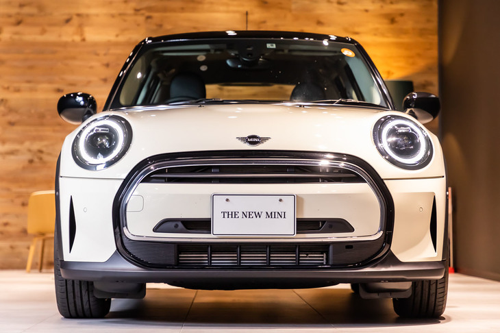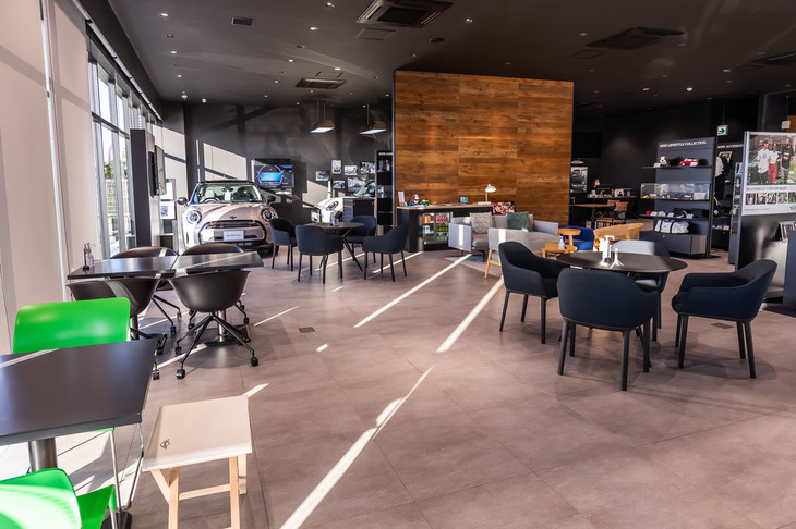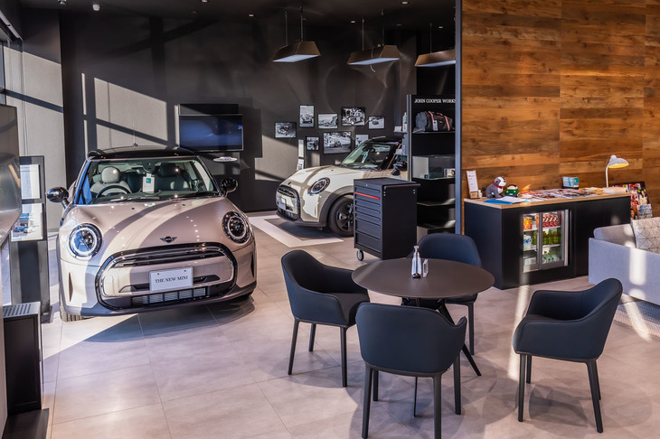 3/28吉田由美さんが訪れたMINIつくばのショールーム。ブラックを基調とするMINIのCI(コーポレートアイデンティティー)に準拠したデザインが目を引く。2021年4月に移転オープンした。