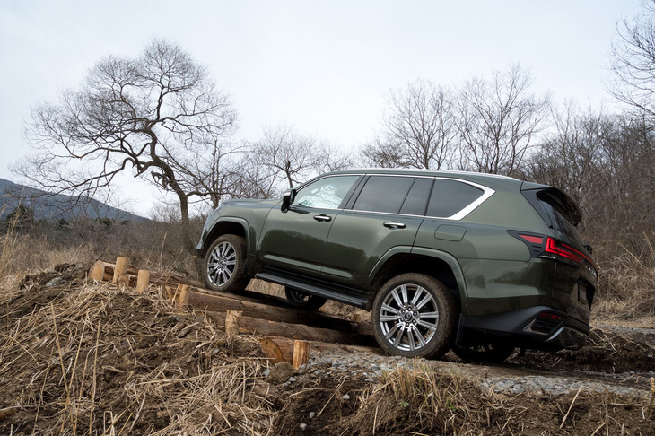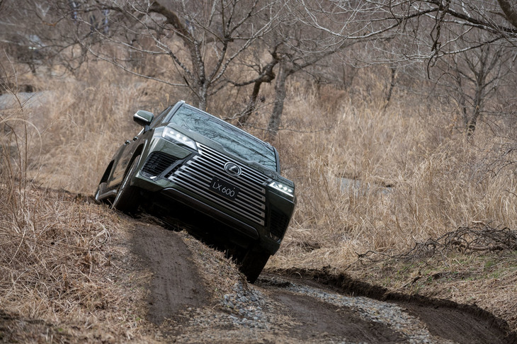 14/36新設されたオフロードコースを行く「LX600“エグゼクティブ”」。地面は前日の雨でぬかるんでいたが、LXは標準仕様のタイヤのままで、悠然と各セクションをクリアしていった。