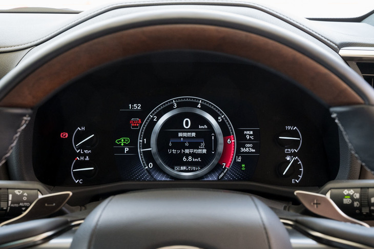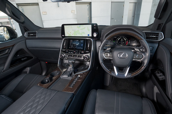 3/36ダッシュボードまわりやドアトリムなど、インテリアの仕様はレクサス独自のもの。イグニッションスイッチには「ランドクルーザー」と同じく、防犯のために指紋認証機能が装備されている。