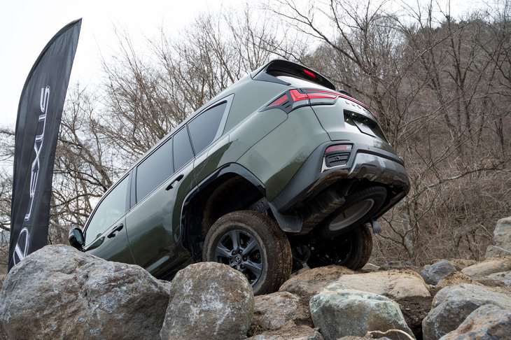 15/36「LX600“オフロード”」は、フロント、センター、リアに3つのデフロックを装備するほか、265/65R18という偏平率の高いタイヤを装着。ただし、クルマのキャラクターの違いから、「トヨタ・ランドクルーザーGRスポーツ」に備わる「E-KDSS」は採用されていない。