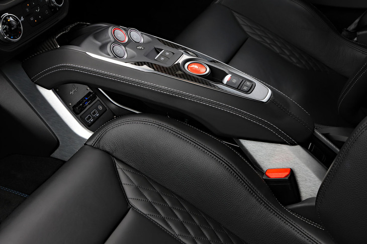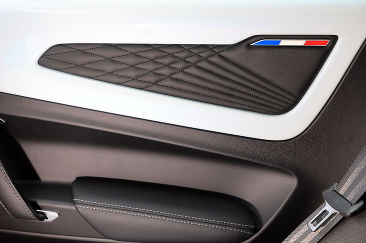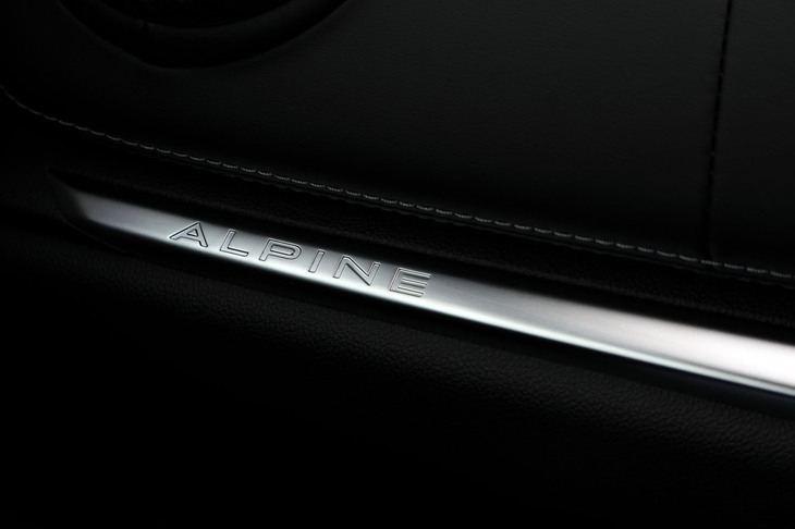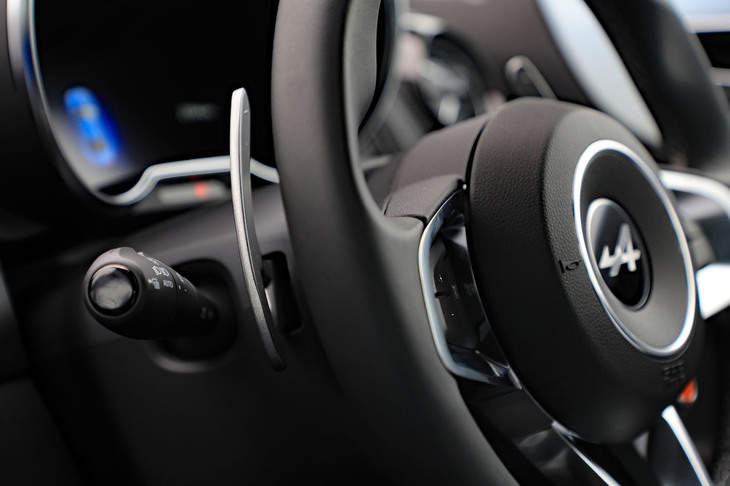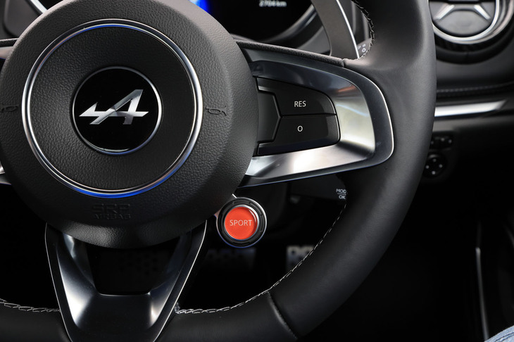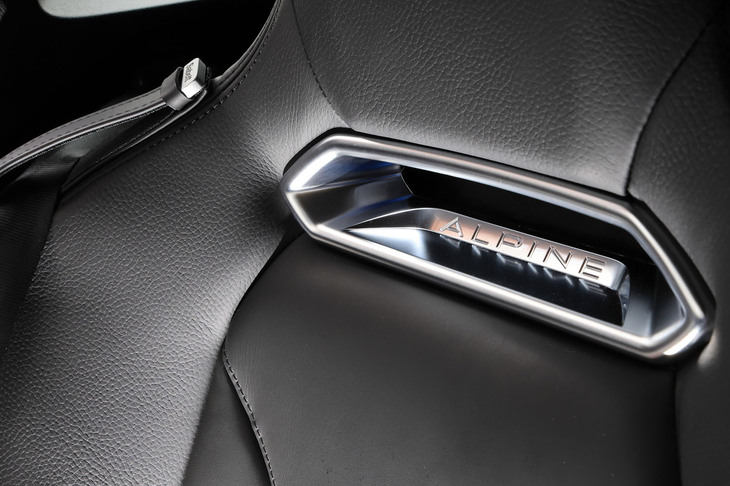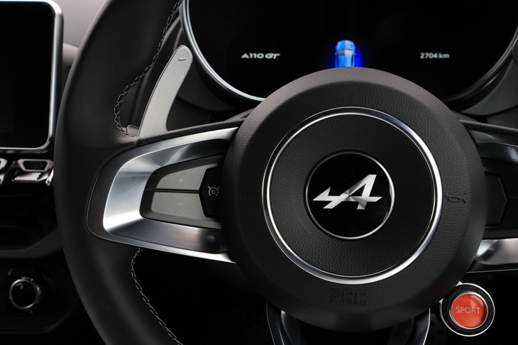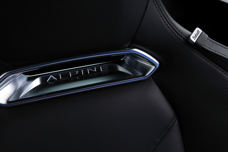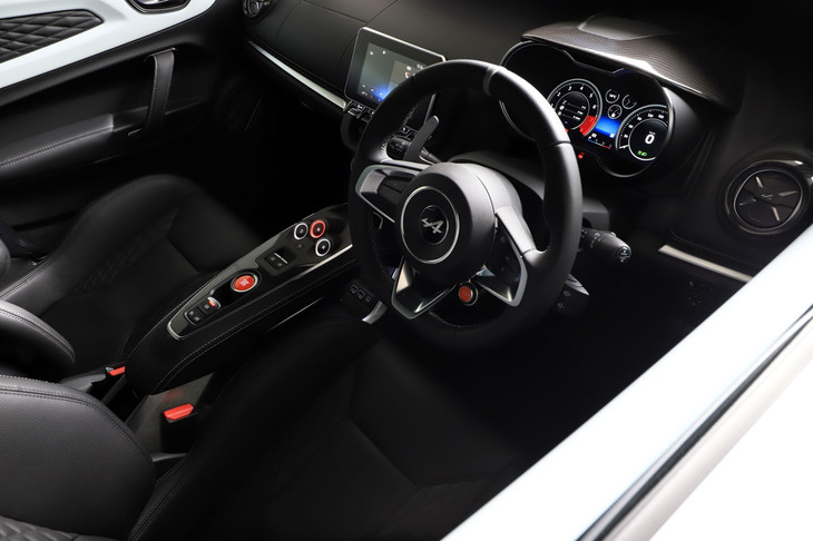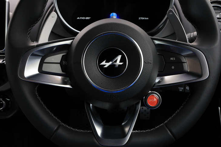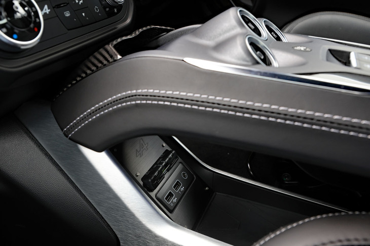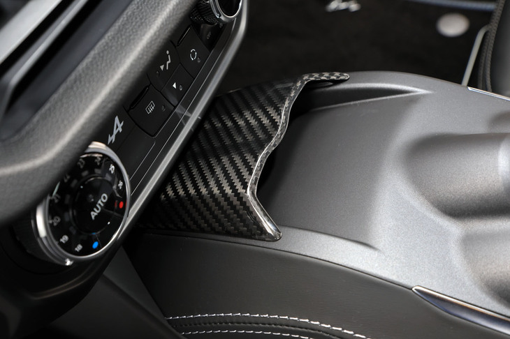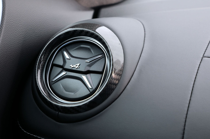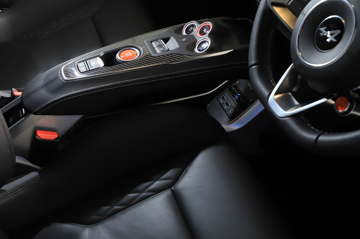 3/70試乗車はラグジュアリーな仕様の「A110 GT」。上質なインテリアにはカーボンやアルミの装飾が控えめにあしらわれ、サウンドシステムにはサブウーファーが追加装備される。