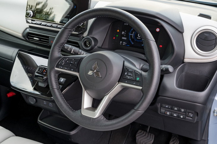 3/22今回の試乗車は上級グレードの「P」。ステアリングホイールは、兄弟車「日産サクラ」ではウレタン製が標準なのに対し、「三菱eKクロスEV」ではグレードを問わず全車革巻きとなる。