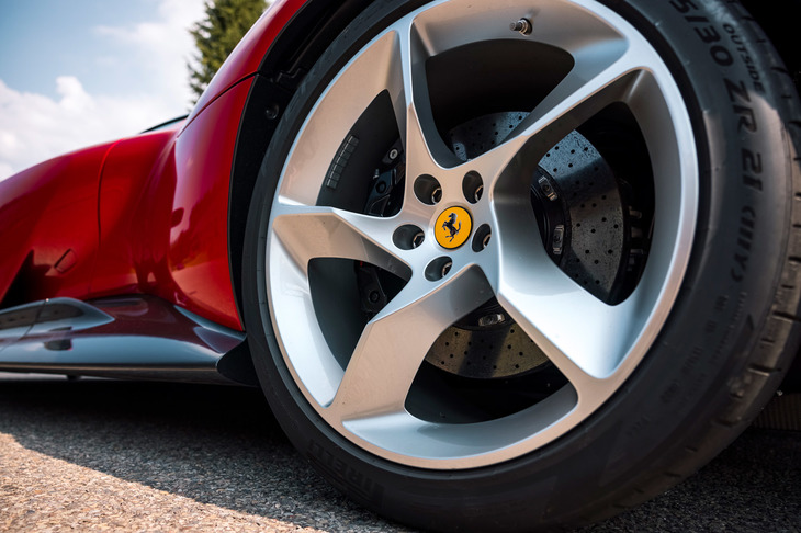 15/23タイヤにはピレリと共同開発した同車専用設計の「Pゼロ コルサ」を採用。特にグリップが低い状況での車両の安定性に重点を置き、ドライ/ウエットの両方でパフォーマンスの向上が図られている。