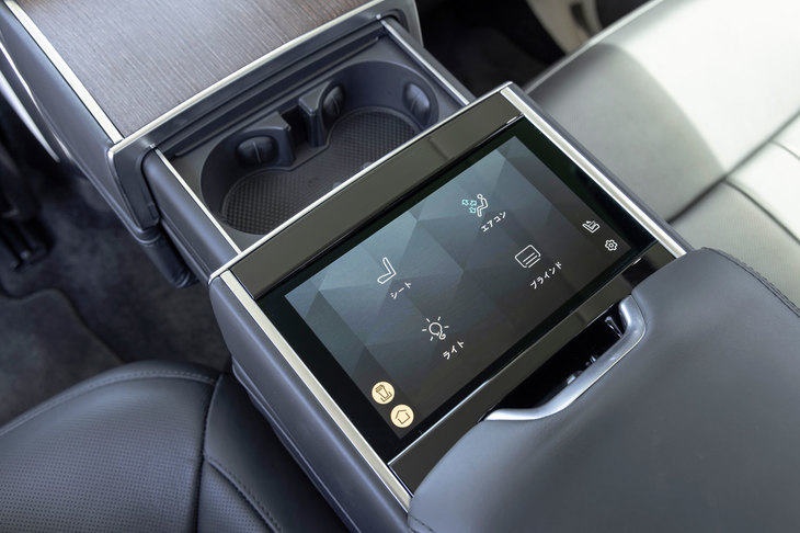 8/21LWBには3列7人乗りや2列4人乗りのシートレイアウトも用意されるが、スタンダードホイールベース(SWB)は2列5人乗りのみ。センターコンソールには後席用空調や車内灯、ブラインドなどの操作に用いるタッチパネルが備わっている。