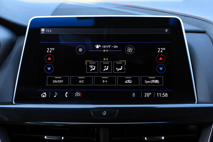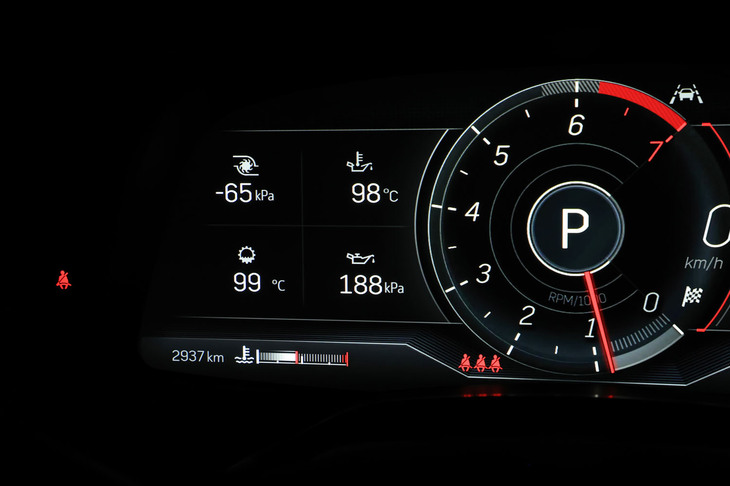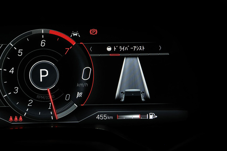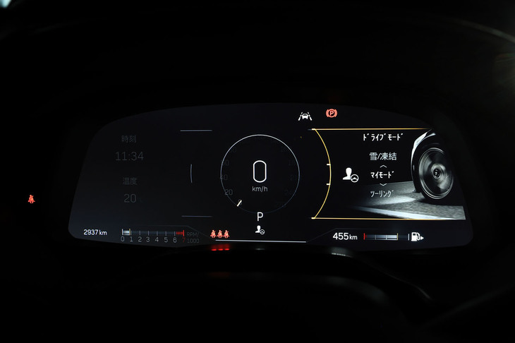 20/105メーターパネルは12インチのカラー液晶。中央部のメーターは「スポーツ」モードではエンジン回転計、他のモードでは車速計となり、その左側には時間や燃費、油温、ブースト圧などの情報を任意で表示させることができる。