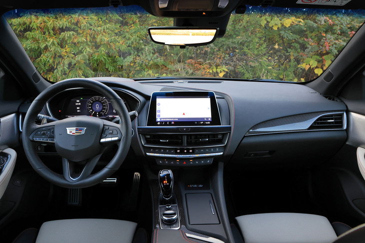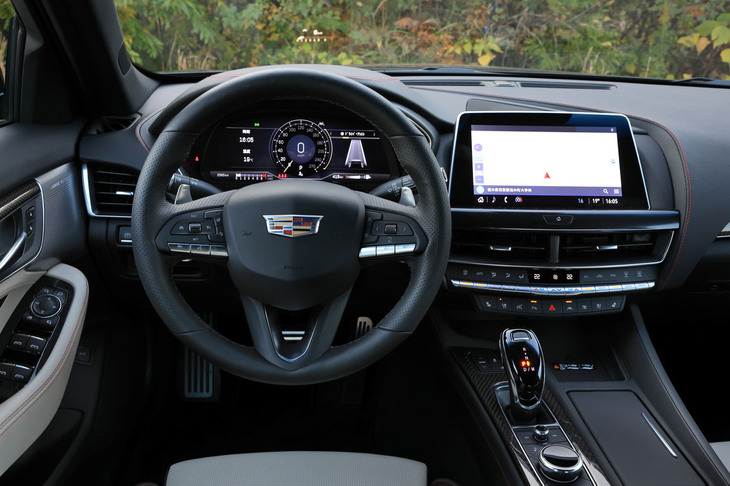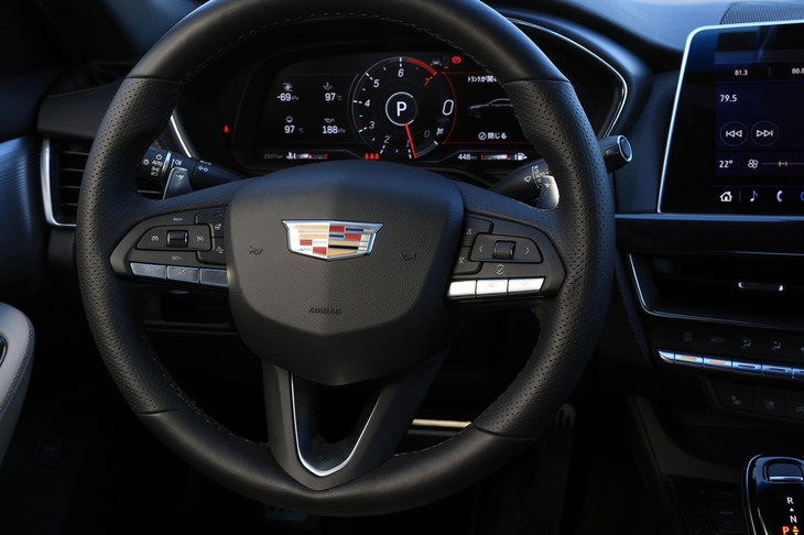 4/105レザーやカーボンファイバーなど、“本物”の素材が惜しみなく使われた「CT5スポーツ」のインテリア。全体のイメージはラグジュアリーだが、リムの太いステアリングホイールやアルミのスポーツペダルなどが、運転好きの心をくすぐる。