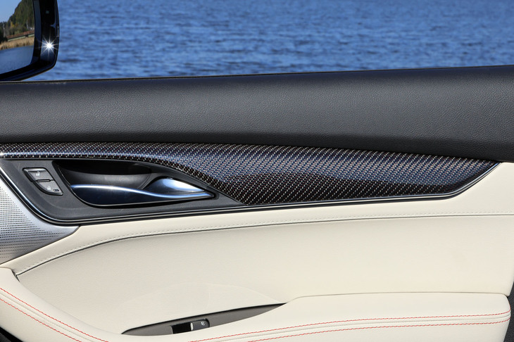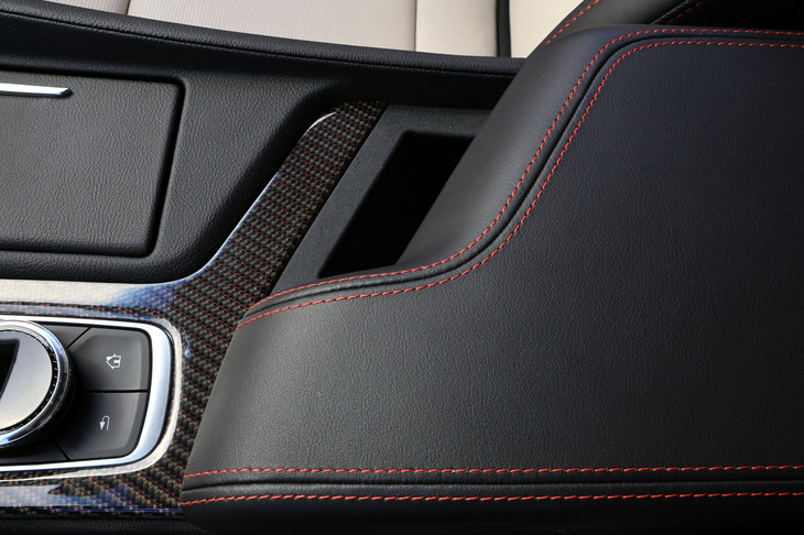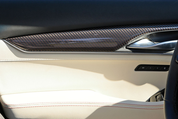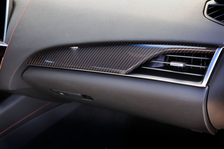 22/105「スポーツ」グレードの内装に用いられるカーボンパネル。そのデザインは2種類の内装色に応じて異なり、内装色が「ウィスパーベージュ/ジェットブラックアクセント」の場合は、繊維に赤いアクセントの入った「モレロレッドスレドゥアクセンティッドカーボンファイバー」が用いられる。