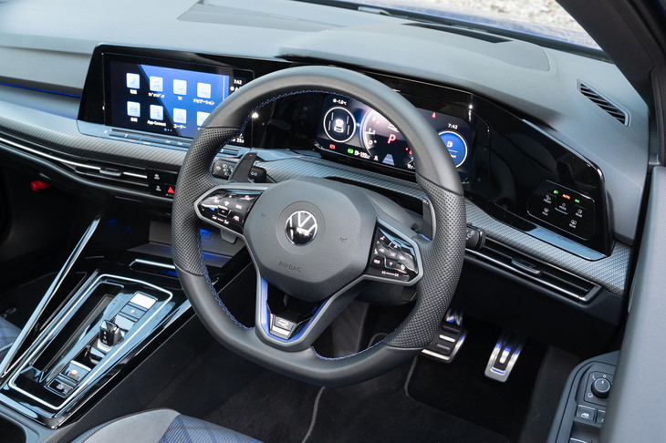 12/23「ゴルフR」には、他のグレードには設定のない専用の走行モード「レース」が用意されており、ステアリングホイールの「R」ボタンで瞬時に呼び出せる。