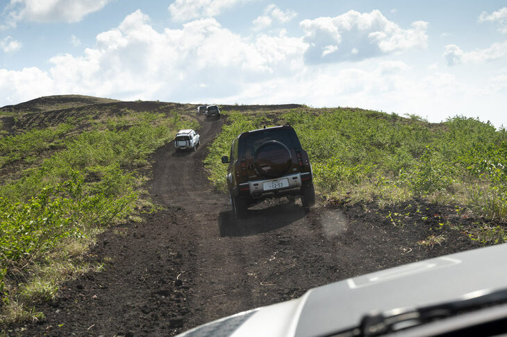 11/29砂浜を横切り、新鼻新山(写真左奥)へと向かう「ディフェンダー」の車列。新鼻新山は1983年の噴火により、一夜でできたという火砕丘だ。
