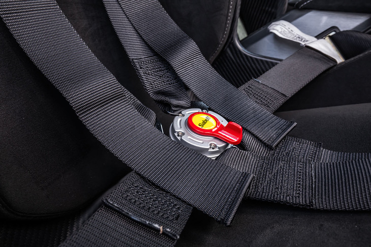 14/19「A110」用としては最軽量となるカーボンシェルのサベルト製フルバケットシート。通常の3点式シートベルトは外され、代わりに6点式のシートベルトが標準で装備される。