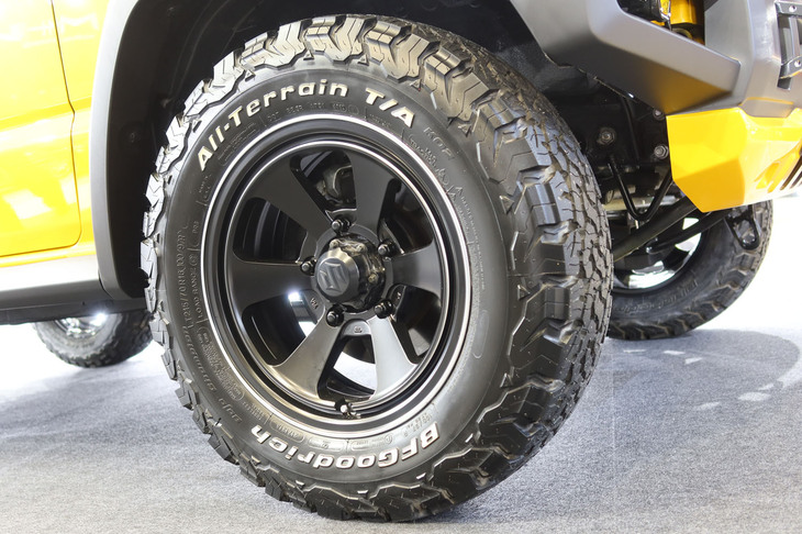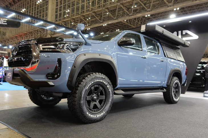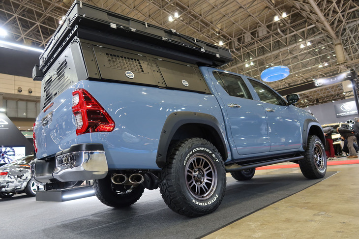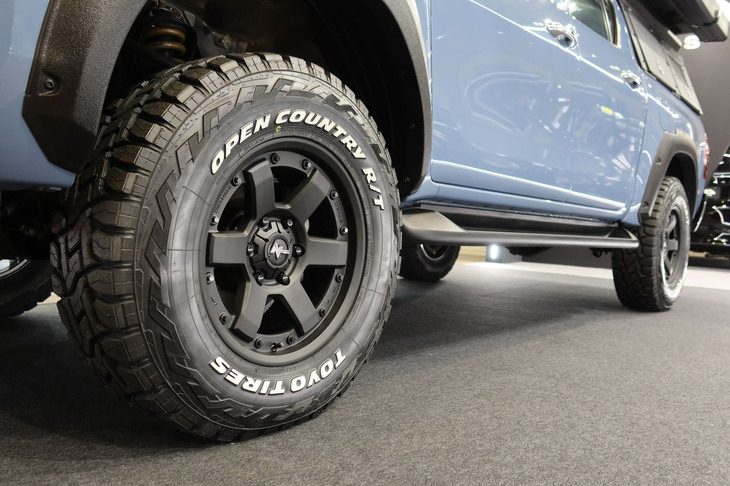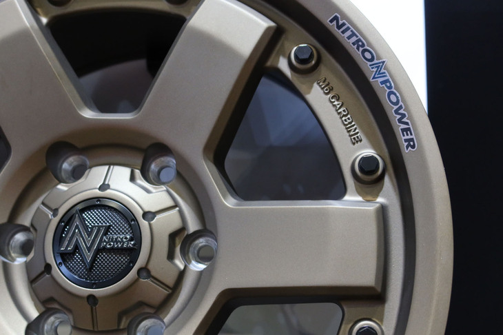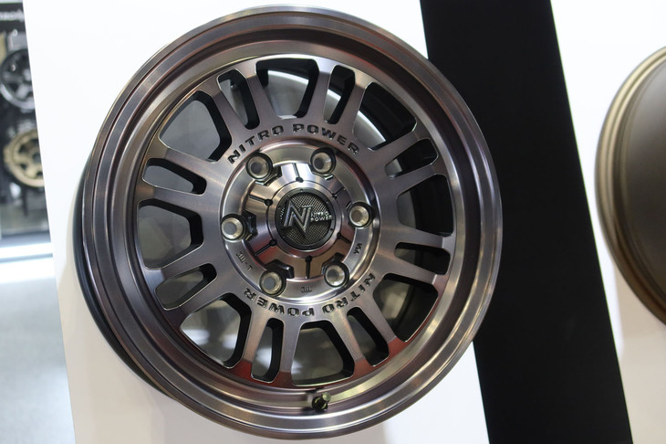13/35タフ系車種にぴったりの「ナイトロパワー」。デモカーの「ハイラックス」(写真)には16本(ツイン8スポーク)の「M16アサルト」が装着されている。
